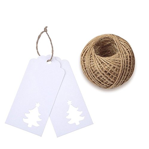 G2PLUS 100 PCS White Paper Hollow Christmas Tree Gift Tags with String, Party Favor Tags, Blank Hang Tags with 100 Feet Natural Jute Twine for Craft Projects, Bonbonniere, Xmas Gifts (White)