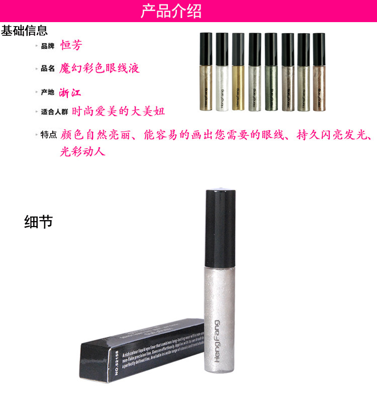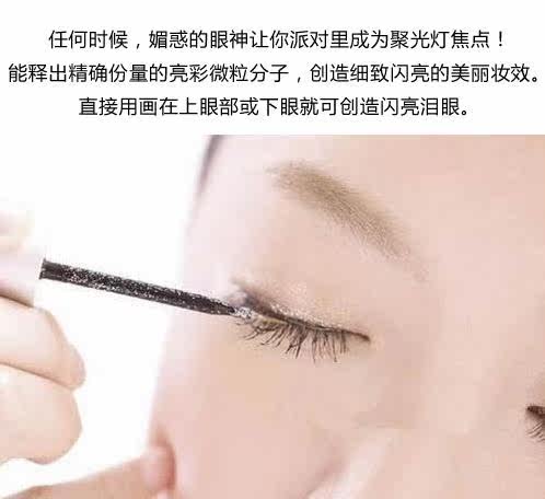 打造泪眼必备的闪亮眼线液哦,质地很细腻,细腻的闪粒,不会很夸张,防水持久不脱妆,在眼角处涂抹一点,立即有楚楚可怜的效果哦,显眼睛大哦,六款色可选,每款都很漂亮~