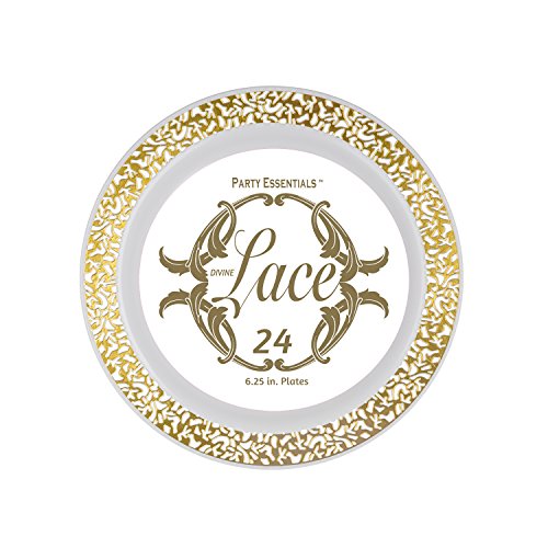 Party Essentials 24-Count Hard Plastic 6.25" Divine Dinnerware Disposable China Bread and Butter/Appetizer Plates, White with Gold Lace Rim