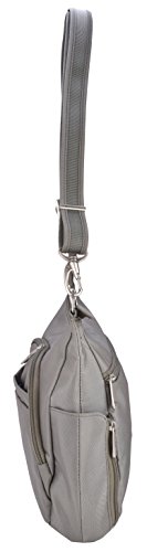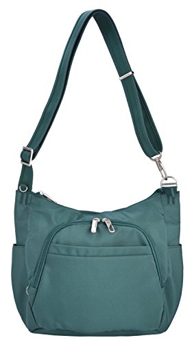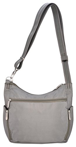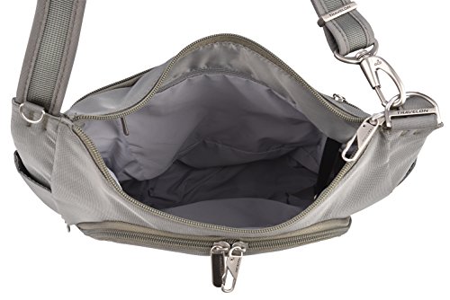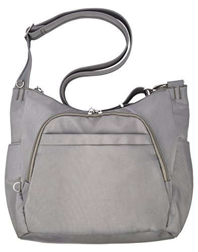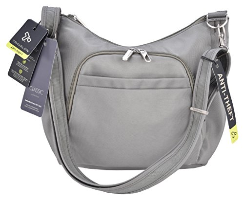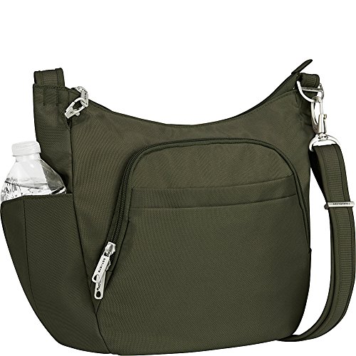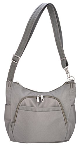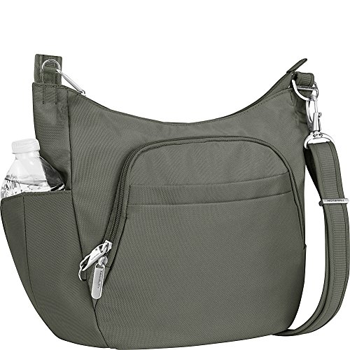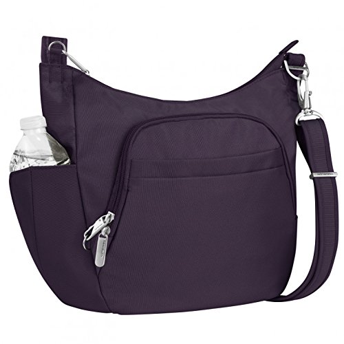 This lightweight cross-body bucket bag is very comfortable to wear, it offers a slash proof strap that can be attached to a post or table with ease. Great size for carrying everyday items as well as a small iPad or reader. The front and main locking comparments offer slash proof construction for peace of mind along with the RFID reader blocking card slots. The outside mesh panels easily store a water bottle and umbrella. .For more than 35 years, Travelon has been making travel easier and safer with products that provide protection, peace-of-mind, safety, security and organization. Travelon's Anti-Theft Crossbody and travel bags protect from pickpockets and thieves and are customer top rated. Classic silhouettes in soft fabrics provide great function and fashion.Feature