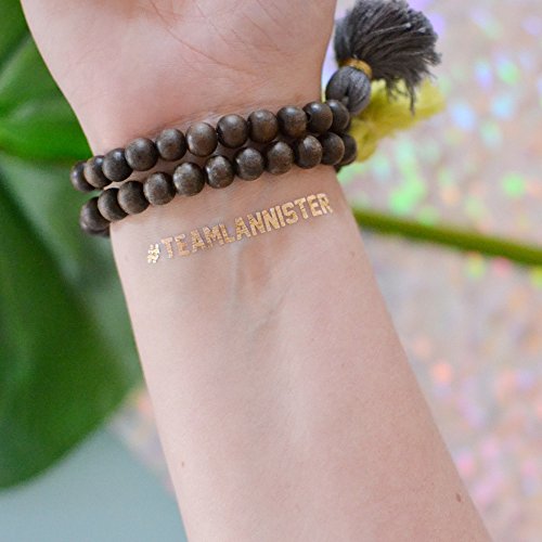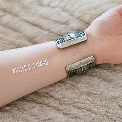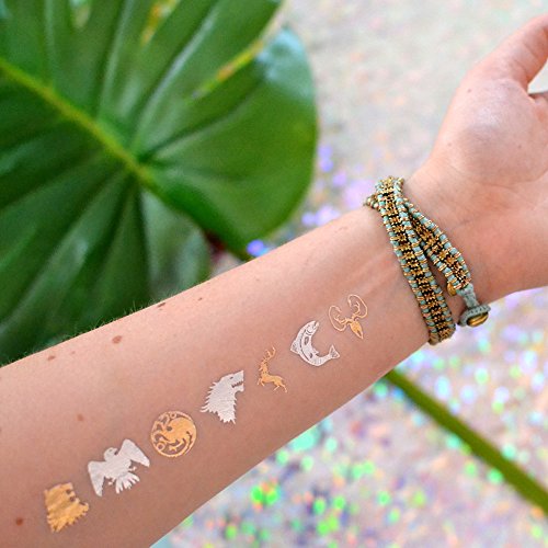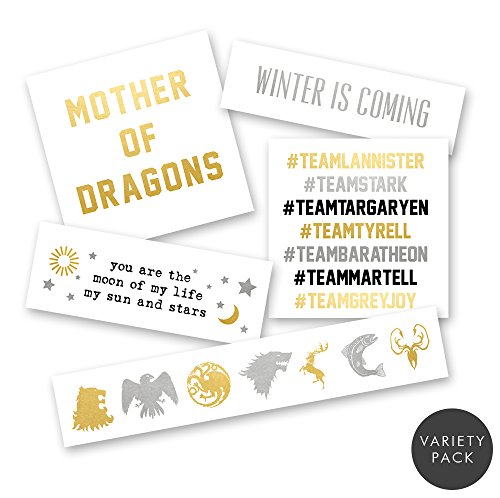 Set includes a mixed variety of 25 Game of Thrones-inspired metallic temporary Flash Tattoos: 7 Houses (5), Mother of Dragons (5), Team Game of Thrones (5), Winter is Coming (5) and Dothraki Love (5)
