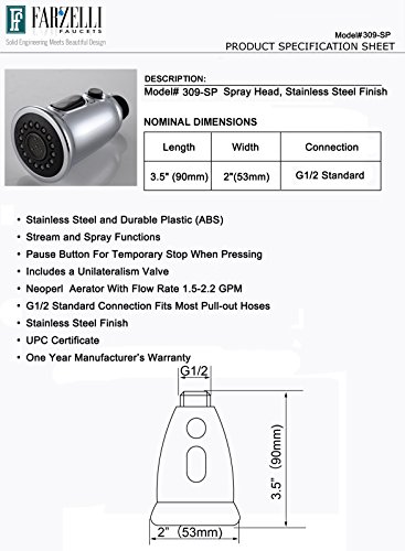 Farzelli F309-SP Pull Out Pull Down Spray Head Replacement Part In Stainless Steel with Stop Revers Valve
