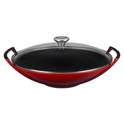 A staple of east Asian cuisine for centuries, woks are perfect for not only stir-frying, but also braising, steaming and stewing. This beautiful wok pairs the traditional curved sides with a flat base that ensures solid contact with any stovetop heat source. A tempered-glass lid locks in moisture while steaming and makes it easy to keep an eye on cooking foods. Constructed from le Creuset's legendary enameled cast iron, this wok is as beautiful to look at as it is to cook with.Feature