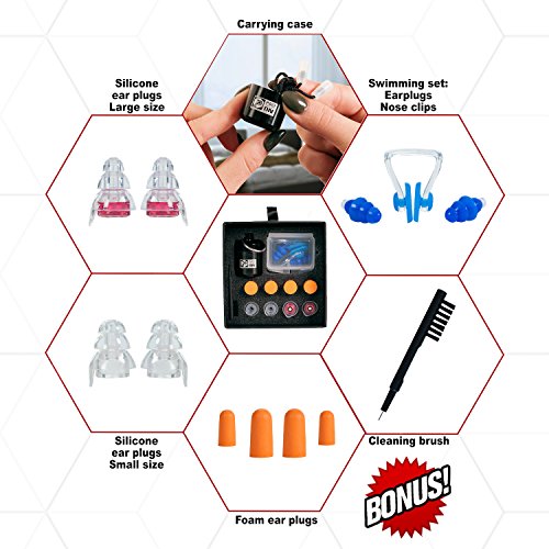 - One-Stop Shop for all your Ear Problems > you'll get 2 Adjustable Noise Reduction Pairs, 1 Swimming Earplugs Clips Set, 4 Sleeping Foam Ear Plugs 1 Unique Cleaning Brush - Yes, everything in a sleek gift box!