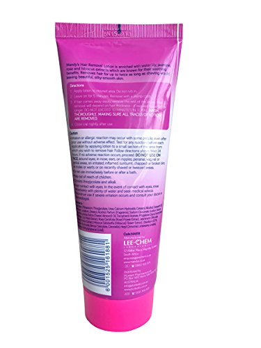 Studio : Lee-Chem Laboratories Publisher : Lee-Chem Laboratories Binding : Misc. Product Description Mandy's Hair Removal Lotion is enriched with water lily, jasmine, rose and hibiscus extracts which are known for their soothing and moisturising benefits. Combined with a fresh, fruity fragrance, it is ideal for all over body use. Our depilatory lotion works in as little as 5 minutes and is suitable for all hair types. It removes hair for up to twice as long as shaving would, leaving beautiful, silky-smooth skin. 0