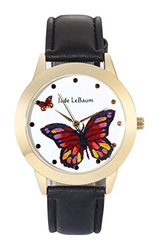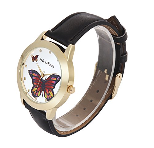 Jade LeBaum Womens Butterfly Watch Big Face Black Leather Strap Gold Tone Case Reloj de Damas JB202811G