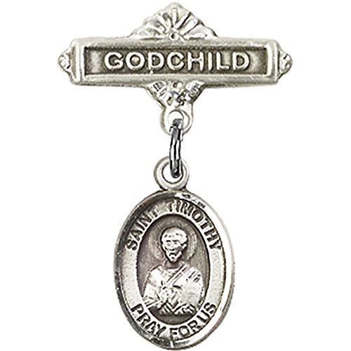 -. Title : Sterling Silver Baby Badge with St. Timothy Charm and Godchild Badge Pin 1 X 5/8 inches