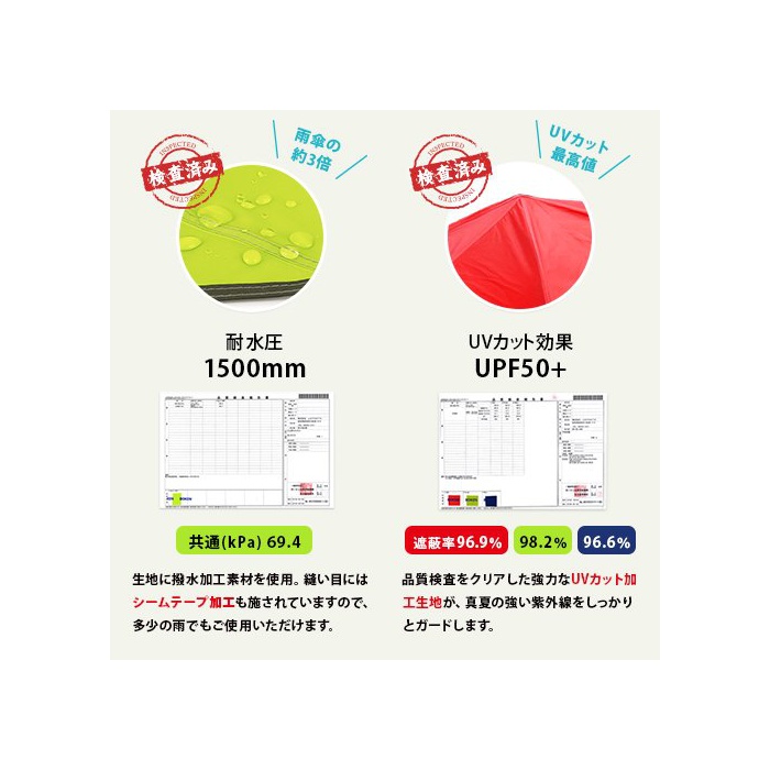 대망의 UV컷 기능을 원단에 추가(UPF50+) 입구의 메쉬창을 한층 더 크게 하여 환기성도 향상 했습니다.캠프용 텐트로서는 물론,공원이나 풀에 썬쉐이드로서도 사용하실 수 있습니다.