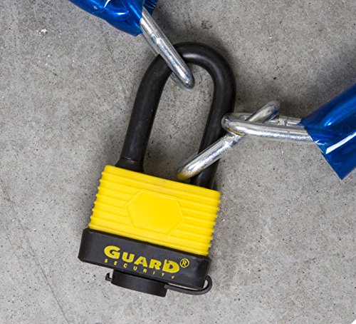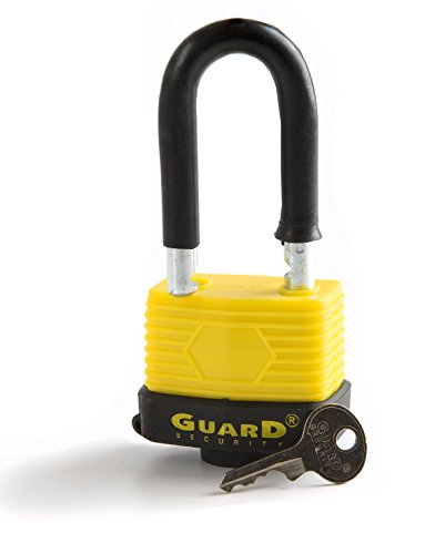 MAXIMUM PROTECTION: Guard Security 55128 weatherproof laminated 2-1/4" long shackle steel padlock. Padlock body is covered by a tough yellow thermoplastic jacket for maximum protection. Precision "O" ring seal on shackle-way resists water and dirt intrusion. Case hardened steel shackle protects against sawing and cutting.