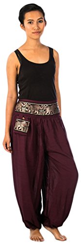 -. Feature : One size fits most ; Loose fit flowy pants / Comfortable elastic half-waistband ; Waist circumference of 40 inches when fully expanded / Elastic around the ankles / Ideal for yoga, casual wear, beach, dance, festivals / 1 side small pocket