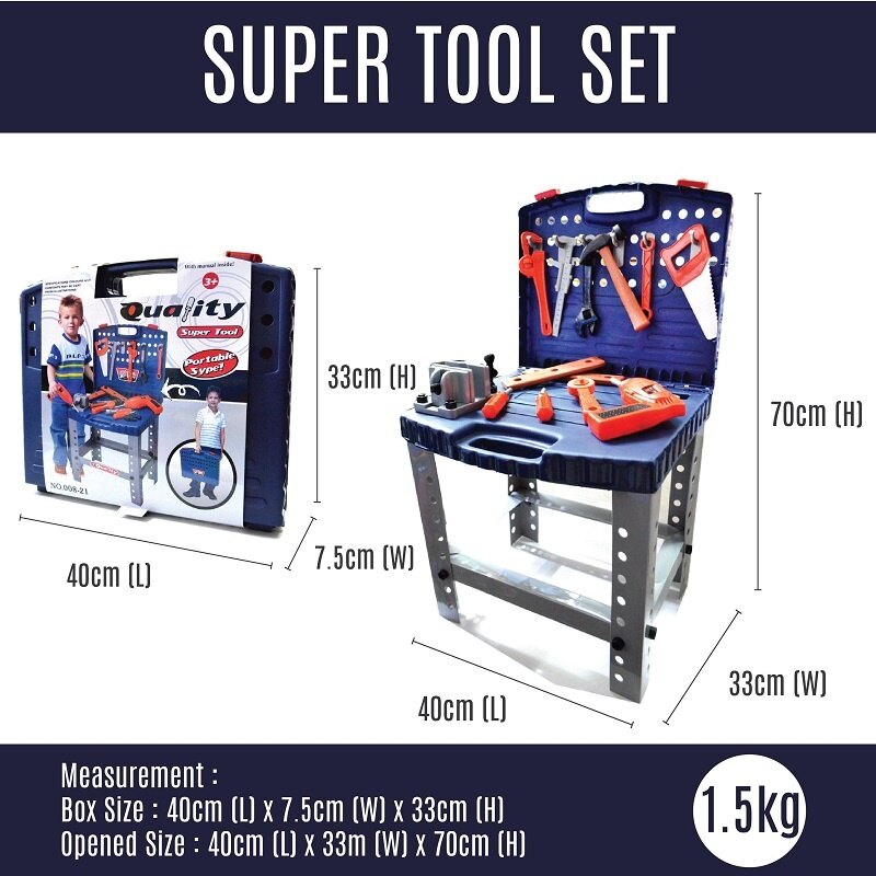 The Super Tool Workshop Bench Pretend Playset will bring out the handyman in any child. It is easy to build up with lots of little tasks to do, it is sure to keep them busy for many hours of DIY fun. Besides, The bench is easily taken apart and packed with the tools into the Carry Case for easy storage. The Rotating drill features interchangeable drill bits which can also be used with the screw driver.