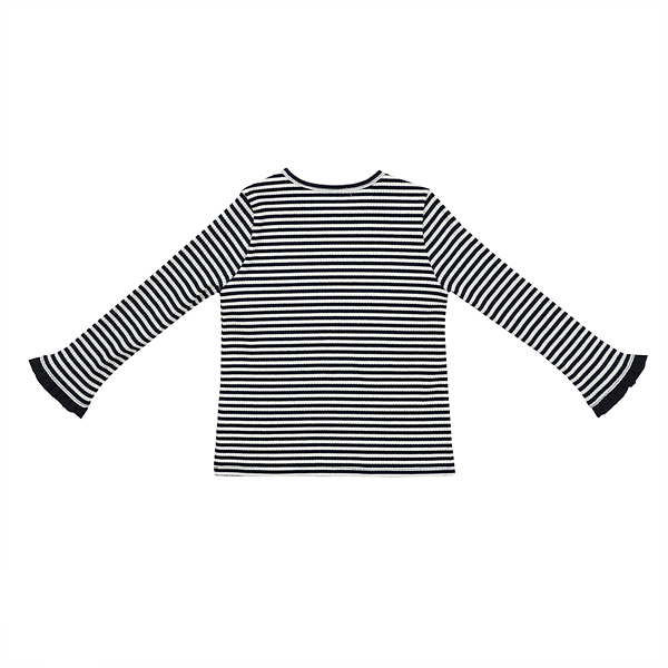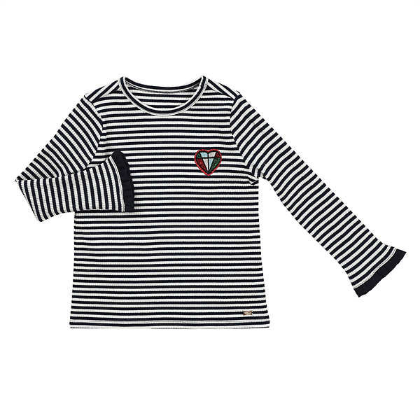 소재-겉감-면95%폴리우레탄5%배색-폴리에스터100%색상-네이비 사이즈-110,120,130,145,155,165상세설명-깔끔한 네이비, 아이보리 스트라이프 골지 티셔츠로 밑단소매 프릴이 귀여움을 더해주며 가슴에 스팽글하트자수가 포인트인아이템.
