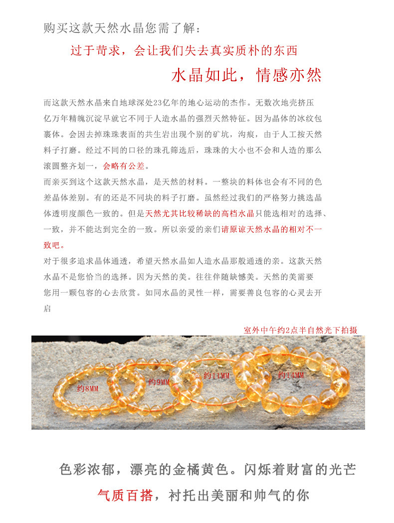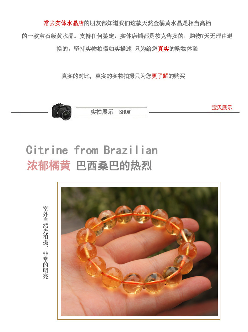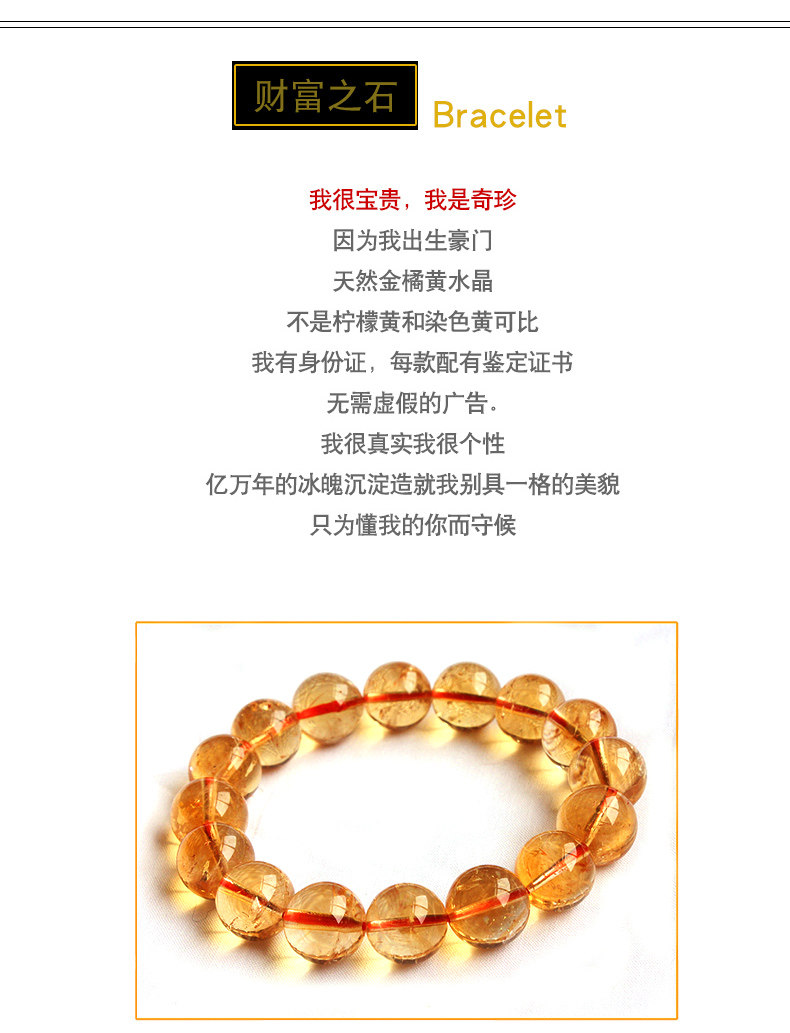 非常保值的一款宝石级天然色的巴西黄水晶手链,正宗的金橘黄是它独特的魅力。最近这个材质的进价一直在升值,本店的卖价是别的卖家进货成本都不够的,完全支持复检和到实体店比价格的!一直在攀升的保值的天然宝贝,进价回馈客户,喜欢的朋友看到千万不能错过的正品实惠灵晶!因为原料一直飞涨,本店一直坚持不高于于成本价感恩回馈,只为和您结缘。