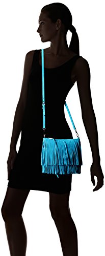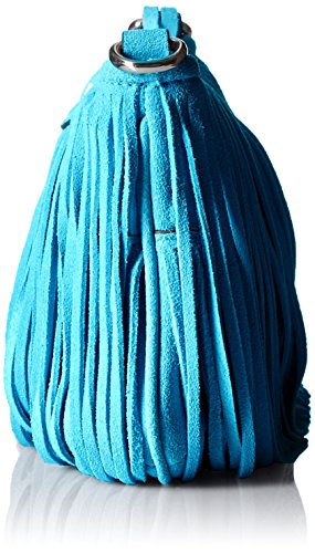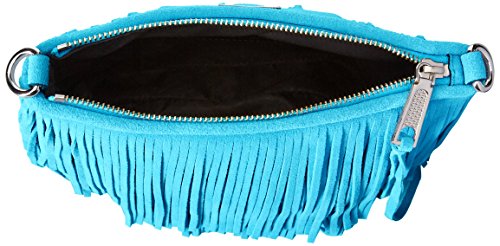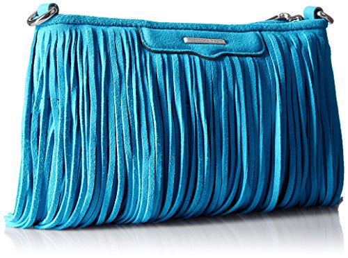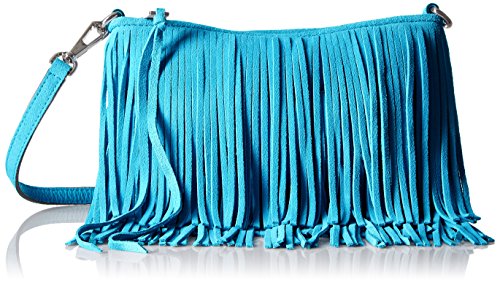 Small zip-top pouch handbag featuring two rows of front fringe and one row at back