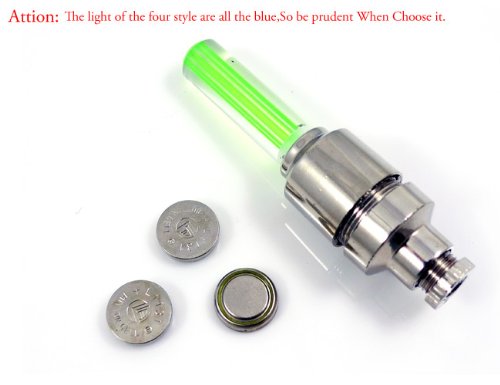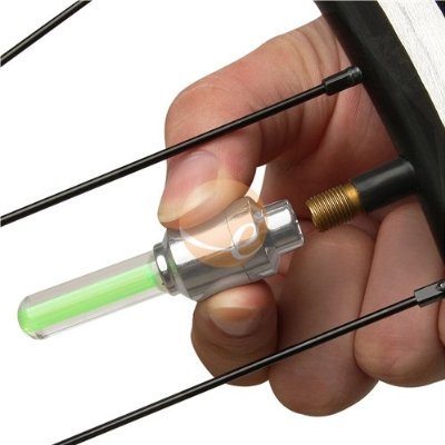 Product Description This LED Bike Wheel Light fits most bicycles, motorcycles and cars. LED Bike Wheel Light features motion sensors, LEDs and replaceable batteries. LED lights will turn on when the vehicle is moving and off when the vehicle comes to a stop. Screws onto the valve stem of your car, bicycle or motorcycle in seconds. Enhances safety by increasing visibility at night and during bad weather conditions. Easy to install and remove. Cap Color: Silver. Light Color: Neon Green. Batteries: 6 x AG10 batteries, 3 batteries per light (batteries included). Package Includes: 2 x LED Bike Wheel Lights; 2 x Valve Covers. 0