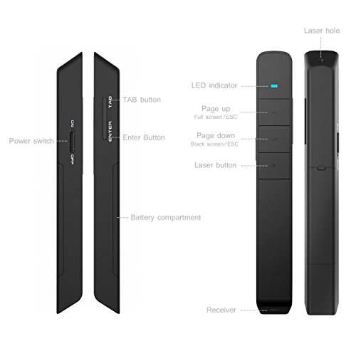 2.4G universal channel, supports Office PowerPoint/Mac OS Keynote;Constant red light design to release your thumb.