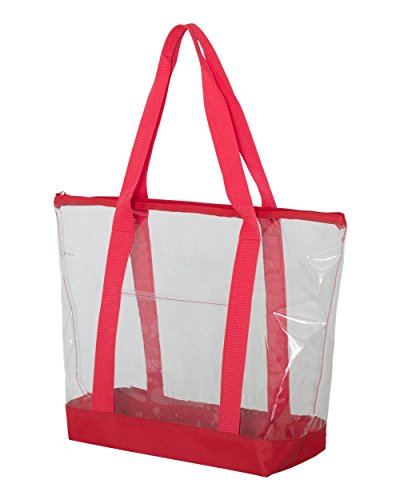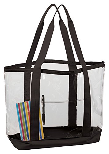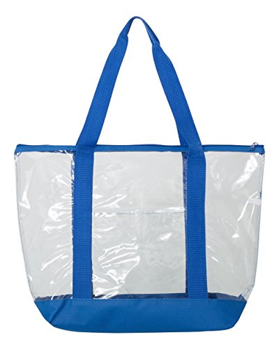 Product Description- .03 mm clear PVC - 600D polyester contrasting straps and bottom - Front pocket - Zipper closure - 25.5" handles - 19" x 14" x 6"0