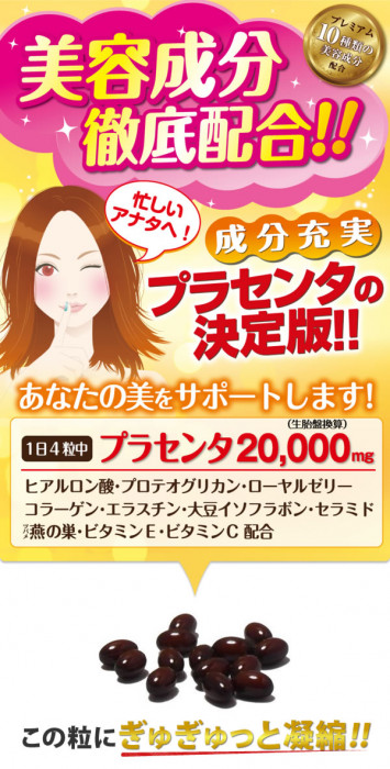 | <h1>1日4粒で20000mg(生胎盤換算)のプラセンタを摂取可能!!さらに10種類の美容成分(ツバメの巣・セラミド・ローヤルゼリー・エラスチン・コラーゲン・大豆イソフラボン・ヒアルロン酸・プロテオグリカン・ビタミンE・ビタミンC)を配合しました。手軽に摂取できるので、毎日の基本サプリメントとしてオススメです!!</h1> |