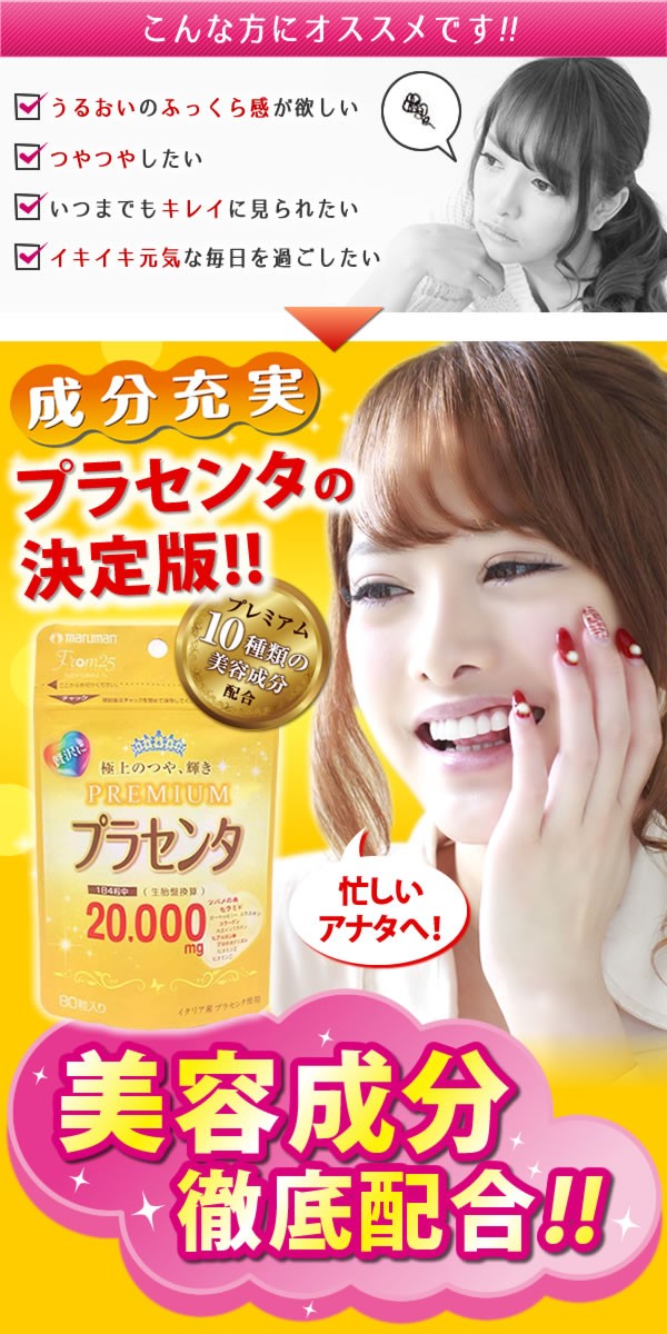 | 1日4粒で20000mg(生胎盤換算)のプラセンタを摂取可能!!さらに10種類の美容成分(ツバメの巣・セラミド・ローヤルゼリー・エラスチン・コラーゲン・大豆イソフラボン・ヒアルロン酸・プロテオグリカン・ビタミンE・ビタミンC)を配合しました。手軽に摂取できるので、毎日の基本サプリメントとしてオススメです!! |