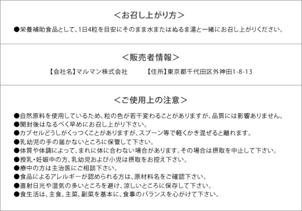 | 【原材料】 サフラワー油、プラセンタエキス末、ヒアルロン酸、プロテオグルカン含有サケ鼻軟骨抽出物、ローヤルゼリー末、コラーゲンペプチド、フィッシュエラスチン、大豆イソフラボン、セラミド、ツバメの巣エキス、ゼラチン、グリセリン、グリセリン脂肪酸エステル、ミツロウ、カラメル色素、ビタミンC、ビタミンE |