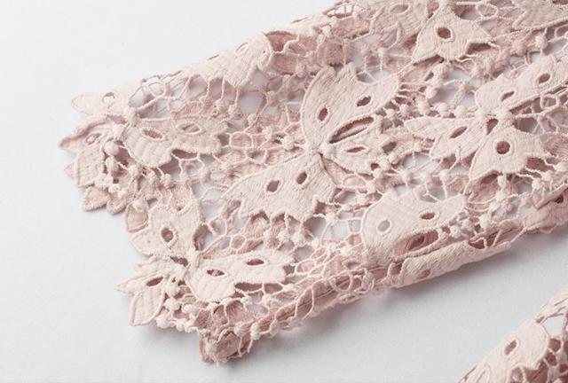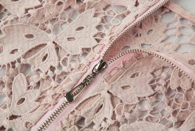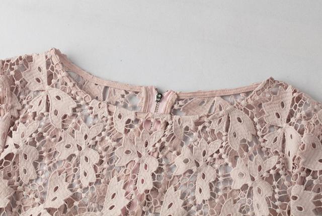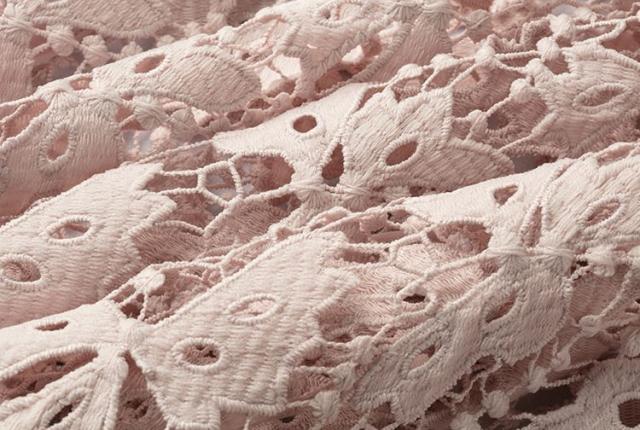袖からデコルテまで透け感があるレース刺繍は今のトレンド。