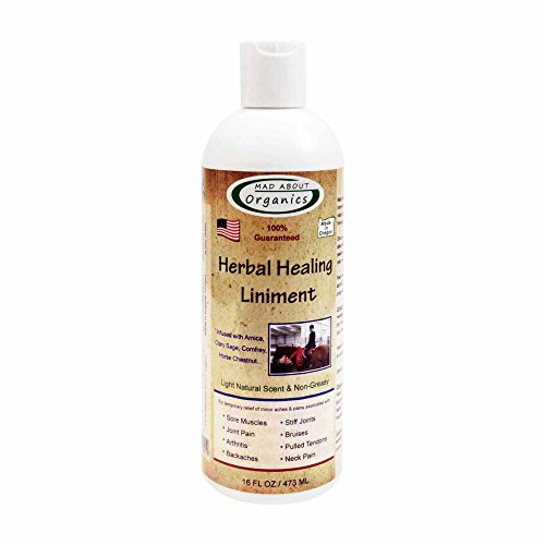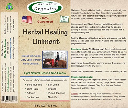 This naturally pure liniment with Arnica, Clary Sage, and Comfrey provides fast-acting relief. Our formula dries fast and will not leave the area oily or greasy, making it an ideal choice. Designed to help heal and dissipate fatigued muscles, stiff joints and arthritis pain very quickly, it is also suitable for injuries that require prolonged heat treatment, such as splints, sprains, bruises, bowed tendons, and bucked shins. It creates a cool rush of relief followed by a soothing, deep-penetrating heat that helps reduce swelling while increasing blood flow to the area. Not only does it work well for our pets we found it works just as well on people. We use only human grade certified organic ingredients, with no added chemical detergents, synthetic fragrances or colors. Our products can be used on animals as young as 4 weeks of age as well as pregnant females, and are completely safe if ingested from self-grooming. Best of all you don't have to wear protective gloves to apply any of our products.Organic Ingredient List:Water, Emulsifying Wax, Vegetable Glycerin, Arnica, Black Pepper, Butchers Broom, Chamomile, Comfrey, Ginger, Horse Chestnut, Nettle, Germaben II, Cajeput, Clary Sage, Nutmeg, Patchouli, Peppermint and Witch HazelNestled in the Pacific Northwest in Eugene Oregon, Mad About Organics started in 2007. Our mission is to take a different approach to protect animals from insects organically, eliminating the traditional toxic chemical treatments that can cause major issues in pets.Like you, we only want the best for our animals and have now developed a complete product line consisting of: Flea and Tick, Advanced Dental Care, Healing Skin/Itch Relief, Soothing Shampoos, Healing Ear Cleaner, Healing Salve and our amazing Healing Liniment.Our goal at Mad About Organics is to continue to provide the safest, most natural and effective animal care products for you and the ones you love.Feature