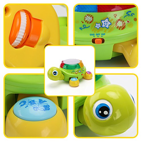 【Forward Function】Two languges modes.Then press the forward key on the leg of turtle.It will say"children,are you ready?Let's go."Press the bigger button on the back of turtle,The little turtle shall sing and crawl,The song shall change intoa new one a new one for every time the button is pressed(3 songs all togethe).If any buttons is pressed,it shall stop crawling.