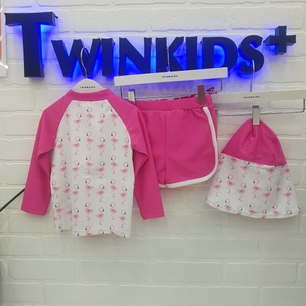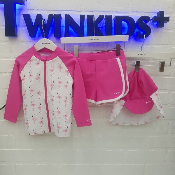 플라밍고 전판 여아 짚업 수영복 팬티가 레이어드되어있어 랍빠 팬츠가 구성됨