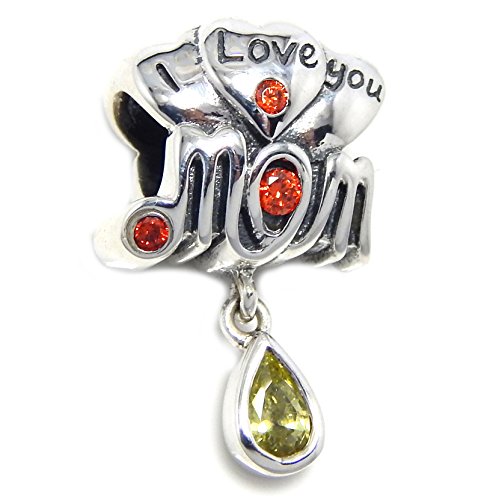 -. Title : Solid 925 Sterling Silver "I Love You Mom w/ Orange CZ & Dangling Peridot Tear Drop" Charm Bead 363 for European Snake Chain Bracelets