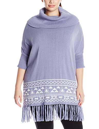 Poncho-inspired sweater featuring ribbed cowl neckline and geometric placement pattern at hem with tassel trim