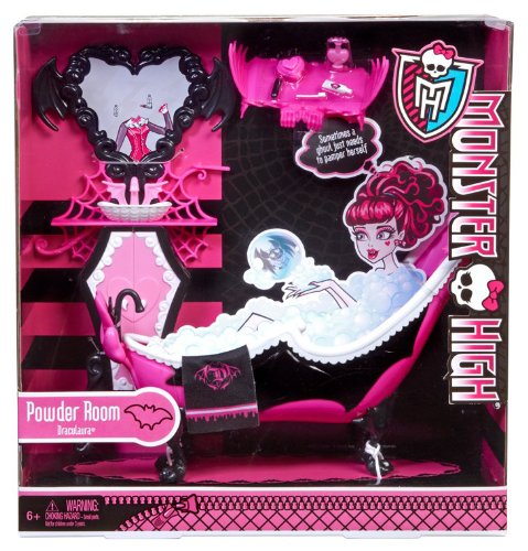 Monster High Draculaura Powder Room Playset Monster High Doll Accessory Collection: As a slow-moving zombie, Ghoulia Yelps will get a kick out of this scooter, while Draculaura can pamper and primp in her powder room. Each Sold separately. Product Features Draculaura can pamper and primp in her powder room Take a soak in the clawfoot tub or gussy up in the mirror This powder room evokes Draculaura's signature style Includes bathtub, mirror and sink, towel and more/li> A must have for any Monster High collection Product Measures: 10.5" x 4" x 13" Recommended Ages: 6-12 yearsFeature