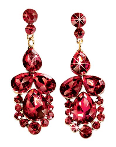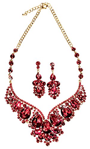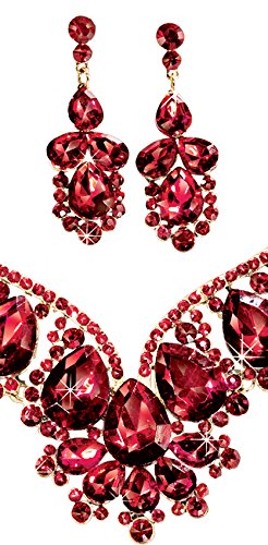 -. Feature : DAZZLING 3 PIECE SET: Fashionable statement jewelry set includes ruby colored faux crystal necklace and earrings / STYLISH: Fashion statement pieces are elegant and brilliant with large faceted stones / QUALITY MATERIALS: Faux rhinestones and acrylic gems; chain 18"l with a 2½"l extender; dangle earrings 3"l / GREAT GIFT FOR: Women, teachers, girls, birthdays, Valentine's Day, Christmas, bridesmaids