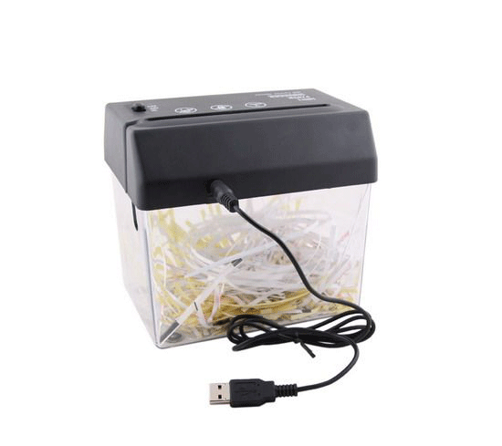 Mini USB shredder can be powered by USB power or 4 AA batteries. Very suitable for the financial, securities systems business place counter bills crushed, confidential, desktop desktop, small size, beautiful appearance. Crushed material for the strip, 2-3 mm wide, broken pieces of paper can be packed packing.
