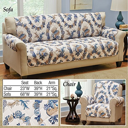 -. Feature : Quilted coral reef-inspired furniture cover. / Helps protect your furniture from spills, stains, pets and more. / Cream background features blue and tan coral and seashells. / Polyester; Machine wash. / Available sizes: Chair (65 x 75 1/2"), Sofa (110"L x 75 1/2").