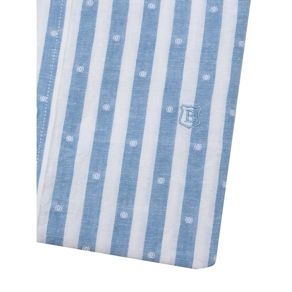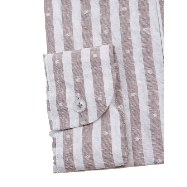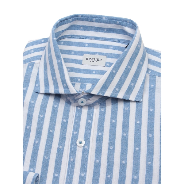 은은한 컬러와 화이트 조합의 도비 스트라이프 원단으로 와이드 카라 디자인에 볼드한 스트라이프 패턴이