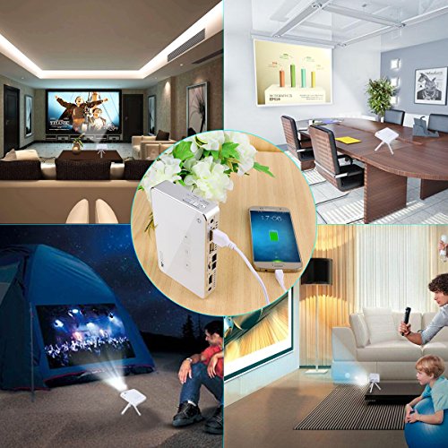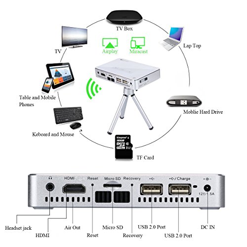 Good choice for movie projector : 500 Lumen/ 75ANSI, 850 x 480 ( WVGA) Resolution and support 1080P and 3D video source. 2100mAh Built-in battery good for travel camping use. Good picture quality and bright enough. This A5 led projector is designed for bedroom movie theater and traveling professionals.