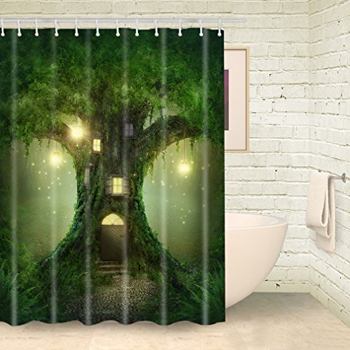 FOOG Fariytale Spirit House Shower Curtain Lighting Door Polyester Fantasy Magic Forest Kids Bathroom Decor Waterproof Mildew Resistant with Hooks -Green (70"Wx78"L)