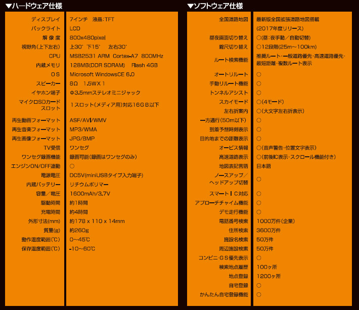 ●オービス情報オービス情報:○(音声警告・位置文字表示)○(音声警告・位置文字表示)