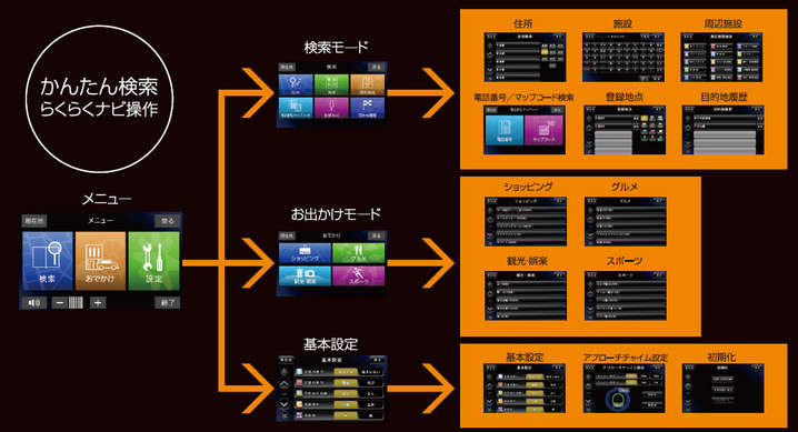 ●ルート検索機能ルート検索機能:推奨ルート・一般道路優先・高速道路優先・最短距離・複数ルート表示推奨ルート・一般道路優先・高速道路優先・最短距離・複数ルート表示