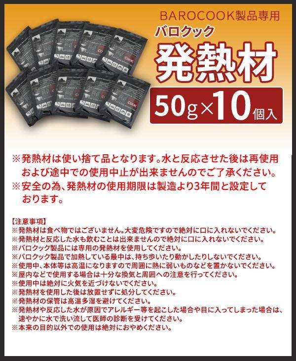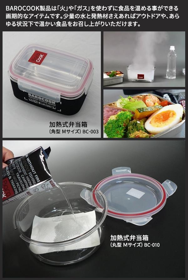 | 火もガスも使わないで温める事ができる弁当箱「バロクックシリーズ」に欠かせない発熱材です。パッケージに記載されている水の量に従ってご使用ください。 |