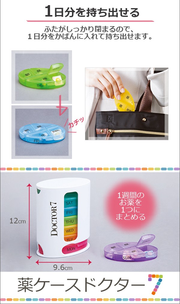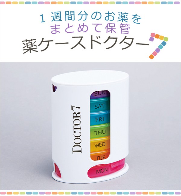 | 1週間分のお薬をまとめて保管できる、薬ケースドクター7。1週間分・曜日毎のお薬を7色の小分けケースに収納できます。また、小分けケースは朝・昼・夜・就寝前と4回分の収納が可能で、半透明で中身が見えるため、飲み忘れも解消できます!更に、小分けケースは、ふたがしっかり閉まるので1日分をかばんに入れて持ち出せ、外出時も便利にお使いいただけます! |