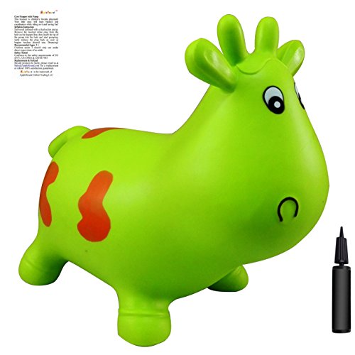 Studio : Apple Round Global Trading LLC Publisher : Apple Round Global Trading LLC Binding : Toy Product Description This jumping cow (bouncy hopper) is children's favorite playmate! Your little ones will learn balance and coordination while riding on the horse and having fun! The product fully complies with EU US Toy Safety Standards. It contains no US banned phthalates and heavy metal elements. Safe to play! The Jumping cow can be inflated to a saddle height of 26 cm/ 10 inches with a regular hand pump. A 9-inch two-way action pump is included for FREE! Recommended Ages: 2 Years . Children under 3 years old should be under direct supervision of an adult. Easy inflation: Take out the inserted white plug (air stopper) from the hole on the cow belly; insert the tip of the pump and inflate the hopper to good size, and then replace the white plug back into the hole quickly. Bounce! FAQs in using this item. Q1: The nozzle doesn't fit, I can't use the pump. A: The inserted white plug (air stopper) on the hopper must be removed first! Inflation Instruction: Step 1: Take out the inserted white plug (air stopper) from the hopper belly Step 2: Insert the tip of the pump into the mouth (built-in variable aperture) Step 3: Pumping the hopper to proper size Step 4: Quickly replace the white plug back into the hole to stop air leak. Done! Q2: The pump doesn't pump out air, How to get a replacement for a faulty pump, or a hopper? A: Should Pump or Hopper be defective, please 'Contact Seller' directly (other than Amazon Customer Service) from Amazon Buyer Central against this order for a replacement or refund. Seller aims to provide hassle-free after-sales service and usually replies most emails in 12 hours. 0