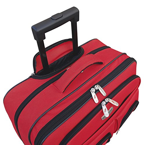 -. Feature : Material: 600D Polyester / Telescopic handle system, In-line blade wheels and top carry handles / Padded laptop section accommodates most 15.6-Inch wide screen laptops / Front organizer pocket and add-a-bag sleeve / Dimensions: 17" L x 13.25" H x 6.5" W - 6.3 lb
