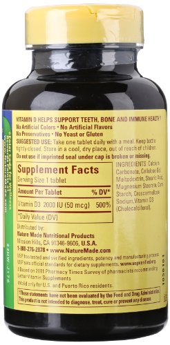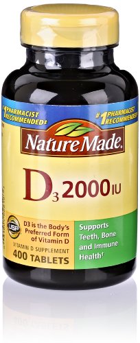 -. Binding : Health and Beauty -. Brand : Nature Made -. EAN : 0031604028183 -. Feature : Vitamin D supports teeth, bone and immune health / Ensuring healthy levels of Vitamin D in your body helps support heart health / Vitamin D supplements come in two forms: Vitamin D2 and Vitamin D3; Vitamin D3 is more effective form for maintaining adE.q.u.a.t.e levels of Vitamin D in the body -. Label : Pharmavite -. Manufacturer : Pharmavite -. NumberOfItems : 400 -. PackageQuantity : 1 -. ProductGroup : Pantry -. ProductTypeName : HEALTH_PERSONAL_CARE -. Publisher : Pharmavite -. ReleaseDate : 2014-04-24 -. Studio : Pharmavite -. Title : Nature Made Vitamin D3 2000 IU, 400 Count (Packaging May Vary) -. UPC : 031604028183