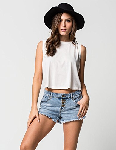 Add a dose of edge with distressed denim and exposed hardware. Your everyday style will thank you for this one. Denim cutoff shorts.Button up front closure.5-pocket style.Salt rinse wave wash.Raw hem.Hand sanding and distressing details.Inseam: 2 inches.Medium Rise: 9 inches.Material: 98% cotton / 2% spandex.Imported.Model measurements:Height: 5'9.Chest: 32".Waist: 25".Hips: 35".Model is wearing size 27.Feature