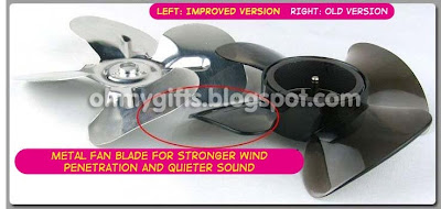 - Metal fan blade (instead of plastic) for stronger wind penetration and quieter sound