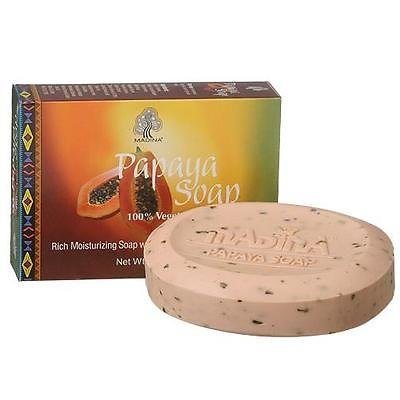 -. Binding : Misc. -. Brand : madina -. Feature : 100% VEGETABLE BASED / Papaya has long been used as a leading ingredient to skin whitening products. / Contains papain, a natural enzyme that promotes skin renewal and cell turnover. It helps in ex foliating the skin to reveal newer cells. / Green tea has anti bacterial and skin-beautifying properties. / Our special formula captures the goodness of papaya and green tea together with Shea butter to give your skin the nourishment it deserves. -. Label : Madina -. Manufacturer : Madina -. ProductGroup : Beauty -. ProductTypeName : BEAUTY -. Publisher : Madina -. Studio : Madina -. Title : Papaya Body Soap Green Tea Skin Whitening Exfoliating Anti Bacterial Madina