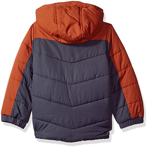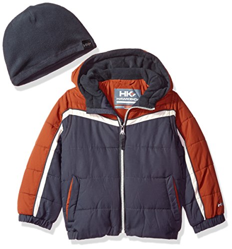 Puffer coat with chest and sleeve stripe, and fleece lined hood.