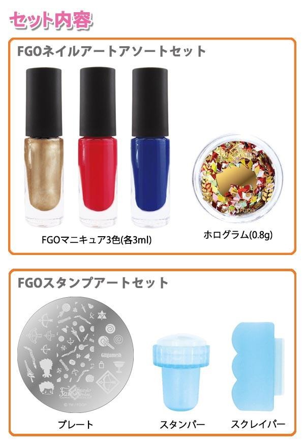| セット内容 | 【FGOネイルアートアソートセット】 FGOマニキュア3色(各3ml)、ホログラム(0.8g) 【FGOスタンプアートセット】 プレート、スタンパー、スクレイパー |