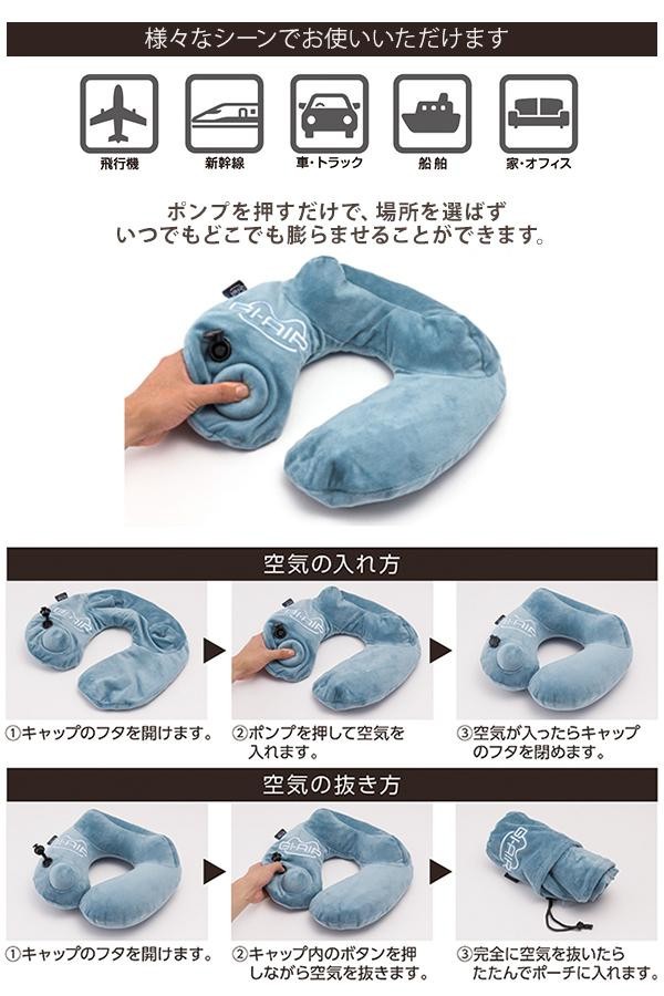 空気注入も空気抜きも指1本で簡単!!人間工学に基づいた設計で首や顎・頭全体をバランス良く支えてくれます。使用後はコンパクトに折りたためます。持ち運び用に便利な収納袋付き。 |